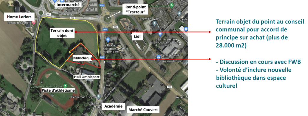 Première information importante: le terrain de ce futur centre est déjà entre les mains de la ville. La commune a un accord pour l’achat de l’espace séparant la bibliothèque communale et le contournement, soit juste en face de l’Intermarché. C’est là que devraient s’implanter les différentes infrastructures. Le point passera d’ailleurs au prochain conseil communal.