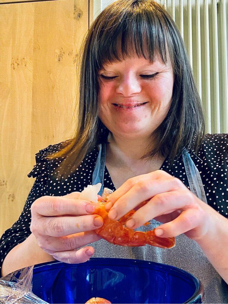 Désireuse de renforcer l’intégration des personnes handicapées dans la société, Nathalie a finalement poussé la porte du centre Haut-Regard, situé à Waremme. Ce dernier a été plus que réceptif, fondant un groupe qui se rend 2 fois par mois, directement chez Nathalie, pour découvrir une recette particulière. Ce sont eux qui font tout, sur base d’une recette préparée par Nathalie. Deux heures de cuisine en groupe.