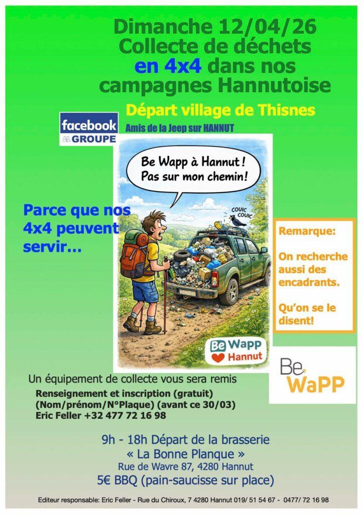 Concept : une opération de ramassage de déchets organisée en 4×4, pour nettoyer les campagnes hannutoises tout en valorisant une pratique souvent mal perçue.