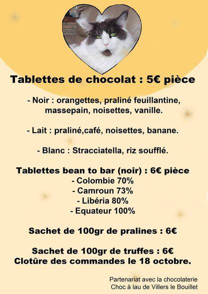 Cependant, le coût du traitement représente un obstacle significatif. Pour aider à financer les soins de Mango, Lorine a décidé d’organiser une vente de chocolats artisanaux en collaboration avec la chocolaterie Choc à Lau, située à Villers-le-Bouillet. Les chocolats proposés incluent des tablettes de chocolat (5 € – chocolat noir, au lait ou blanc), des tablettes bean to bar (6 € pour la version noire), ainsi que des sachets de pralines et de truffes (100G – 6 € chacun). La clôture des commandes est prévue pour le 18 octobre.