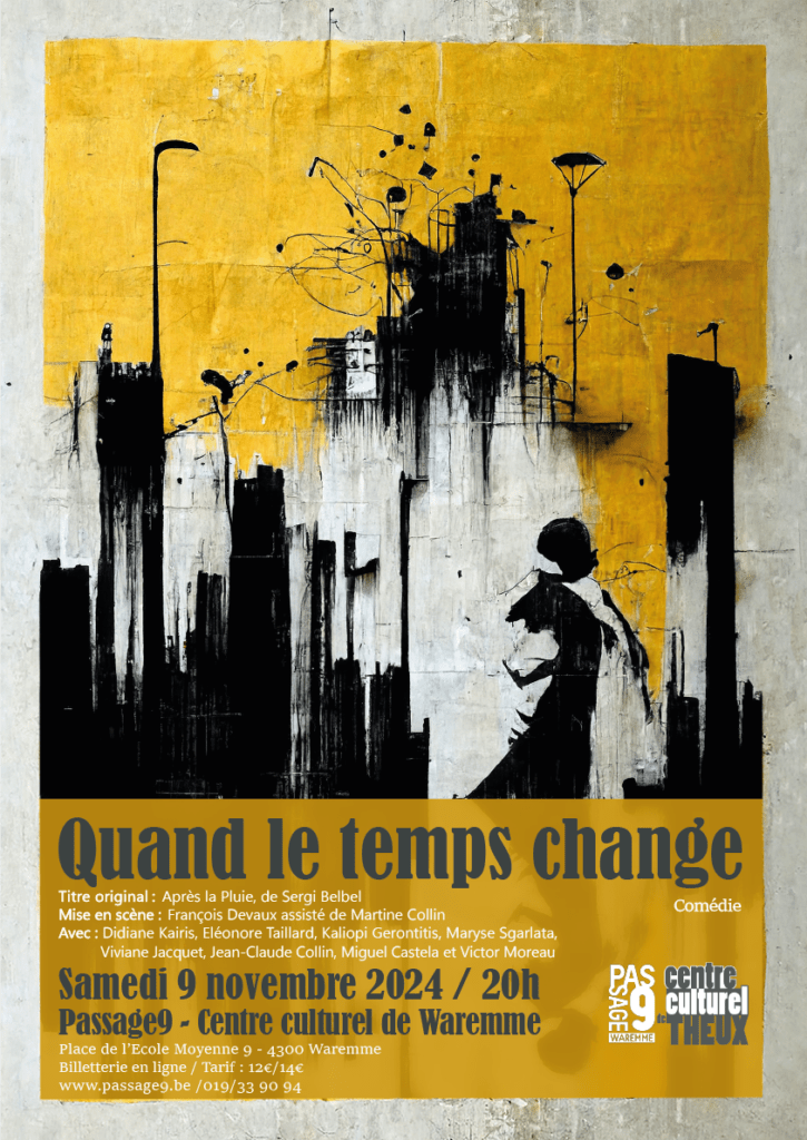 Le 9 novembre, la troupe du Centre culturel de Theux revient sur les planches du Passage9 du Centre culturel de Waremme, avec une nouvelle pièce de théâtre: Quand le temps change. Cette comédie grinçante et subtile est une adaptation de « Après la pluie » de l’auteur catalan Sergi Belbelde, qui invite les spectateurs à plonger dans l’univers tendu d’une multinationale en pleine crise morale et environnementale.